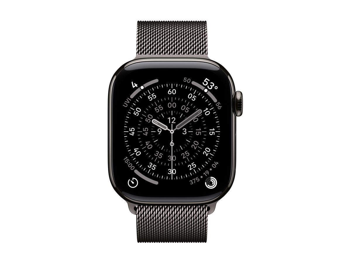 | Opis: | Apple Watch Series 11 (GPS + Cellular) - 42 mm - titanium łupkowy - inteligentny zegarek z pętla mediolańska - siatka ze stali nierdzewnej - łupek - rozmiar nadgarstka: 130-180 mm - 64 GB - LTE, Wi-Fi 4, UWB, Bluetooth - 5G - 34.6 g |